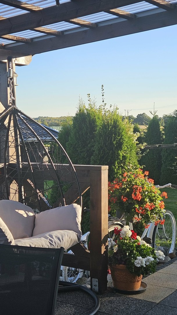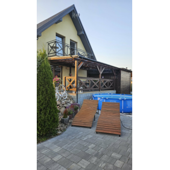 Dom posiada duży zadaszony taras z miejscem do rodzinnego posiłku oraz strefą wypoczynku z leżakami i stolikiem kawowym.
