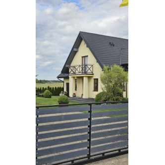 Dom otacza zadbana, ogrodzona działka z miejscem parkingowym.
